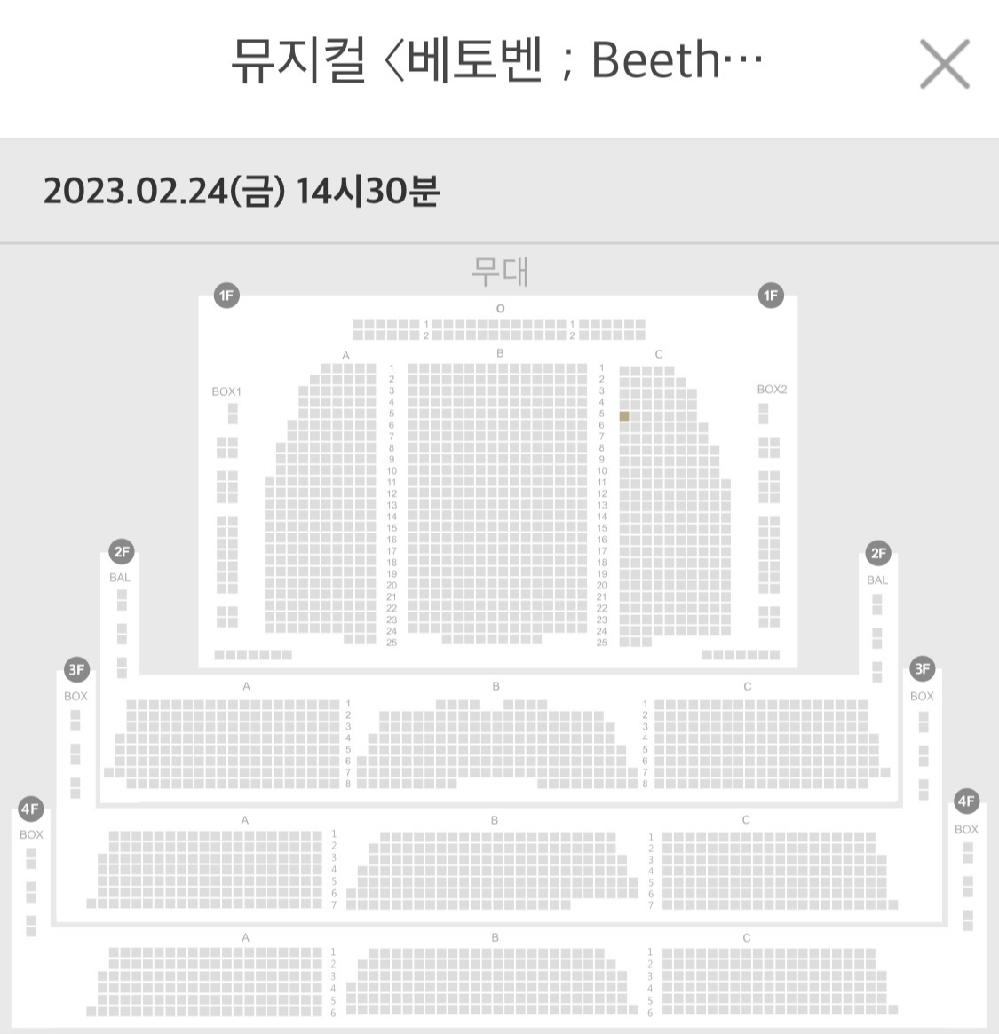 뮤지컬 베토벤은 예술의전당 오페라하우스에서 공연을 하는 만큼 좌석에 따라서 보이는 부분들이 다를 거라고 생각합니다. 예술의 전당을 공연장의 규모가 큰 편이기도 하고 베토벤의 생생함을 느끼려면 당연한 이야기 일 수 있겠지만 앞으로 가시는 걸 추천합니다. 처음 같은 날 뒤쪽에 예매에 성공했었습니다. 하지만 거의 매일같이 좌석을 확인하며 앞으로 가길 기대했는데 마침 1층 C구역 5열에 자리가 생겨서 바로 다시 예매를 했습니다.